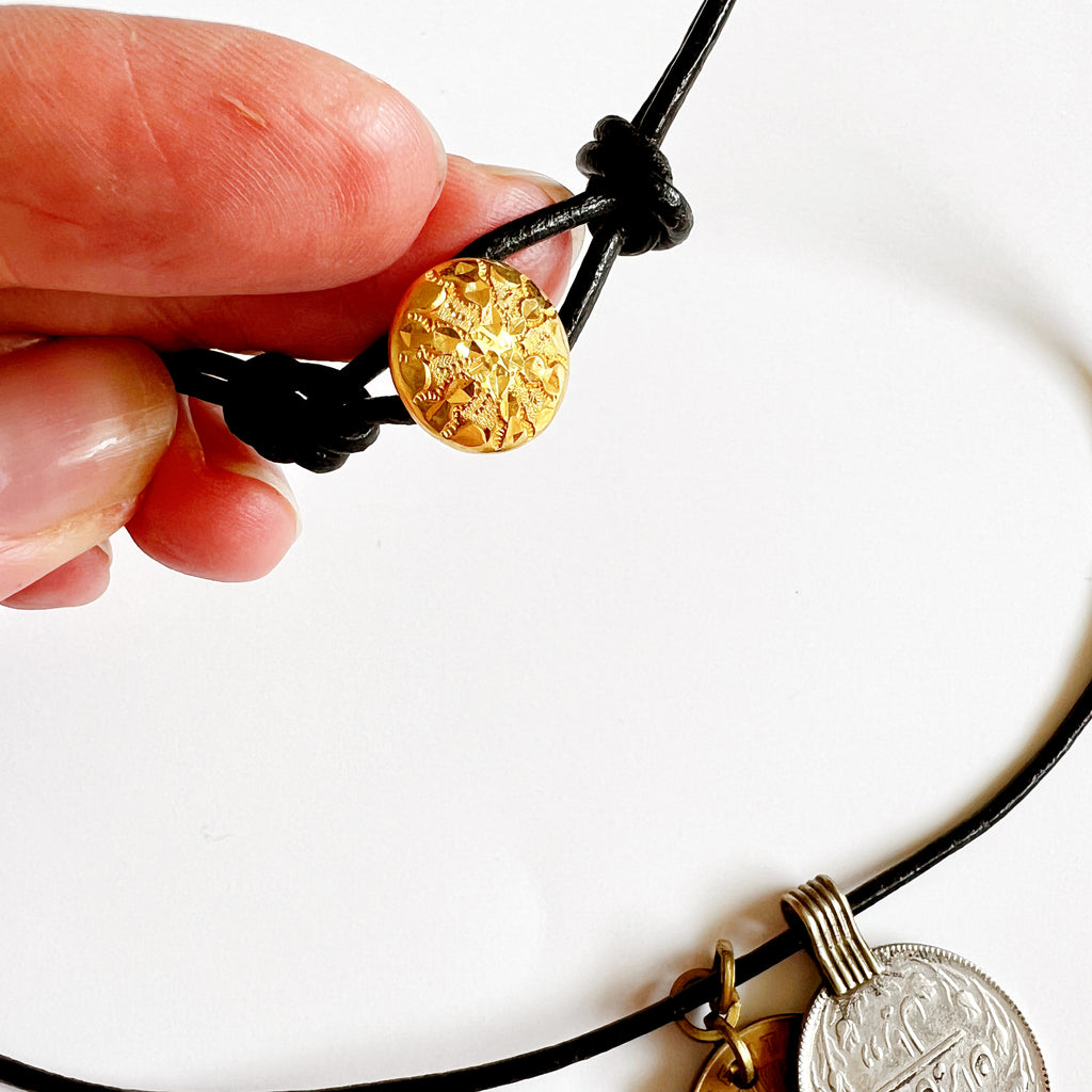 An eclectic set of vintage charms strung simply on a durable leather cord. Closure is a simple knot closure which includes a beautiful vintage brass button from the 1920’s.