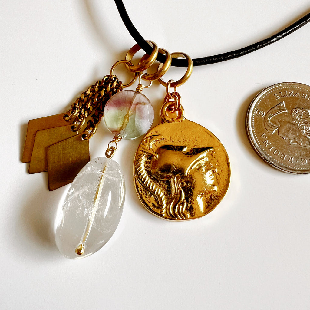 An eclectic set of vintage charms strung simply on a durable leather cord. Closure is a simple knot closure which includes a beautiful vintage brass button from the 1920’s.