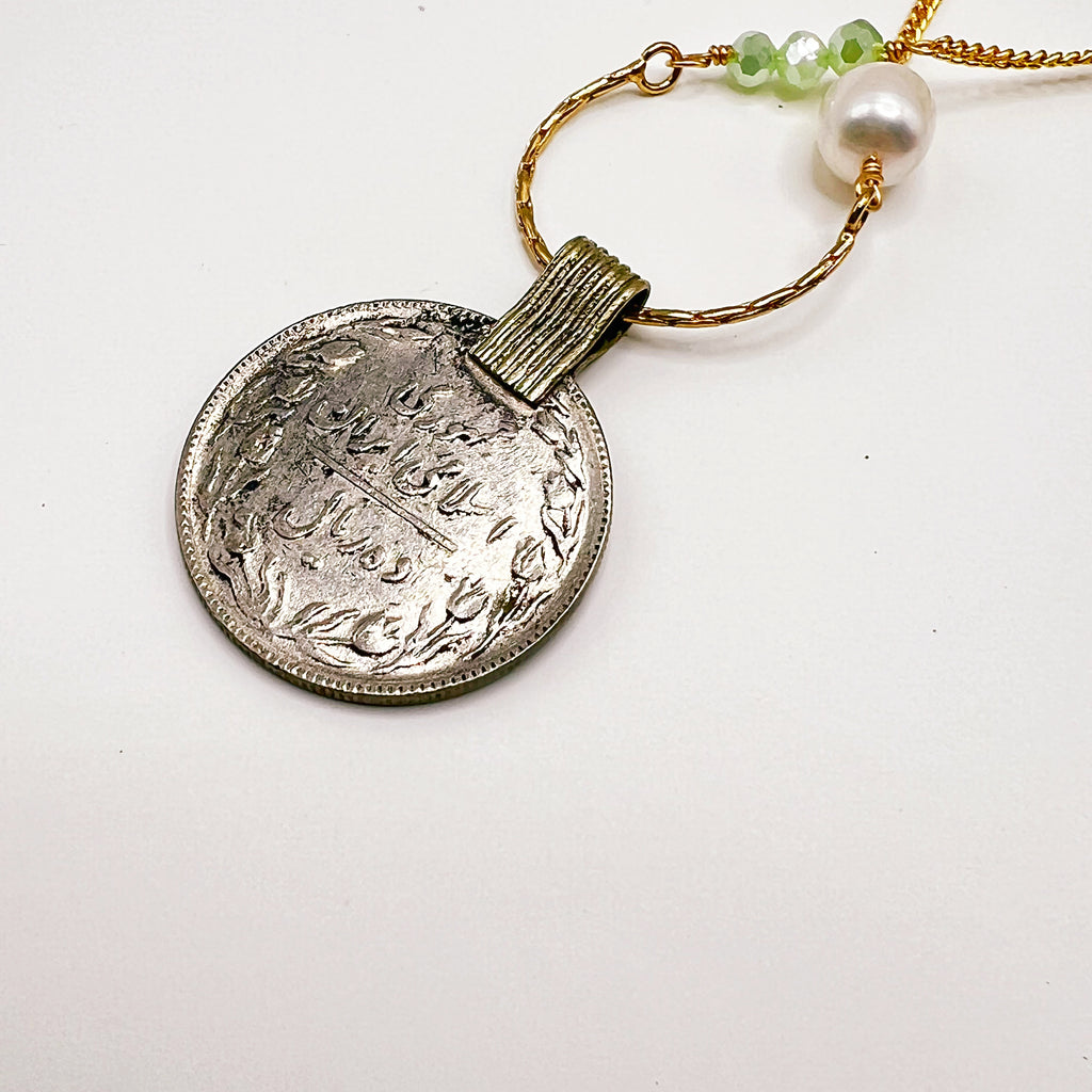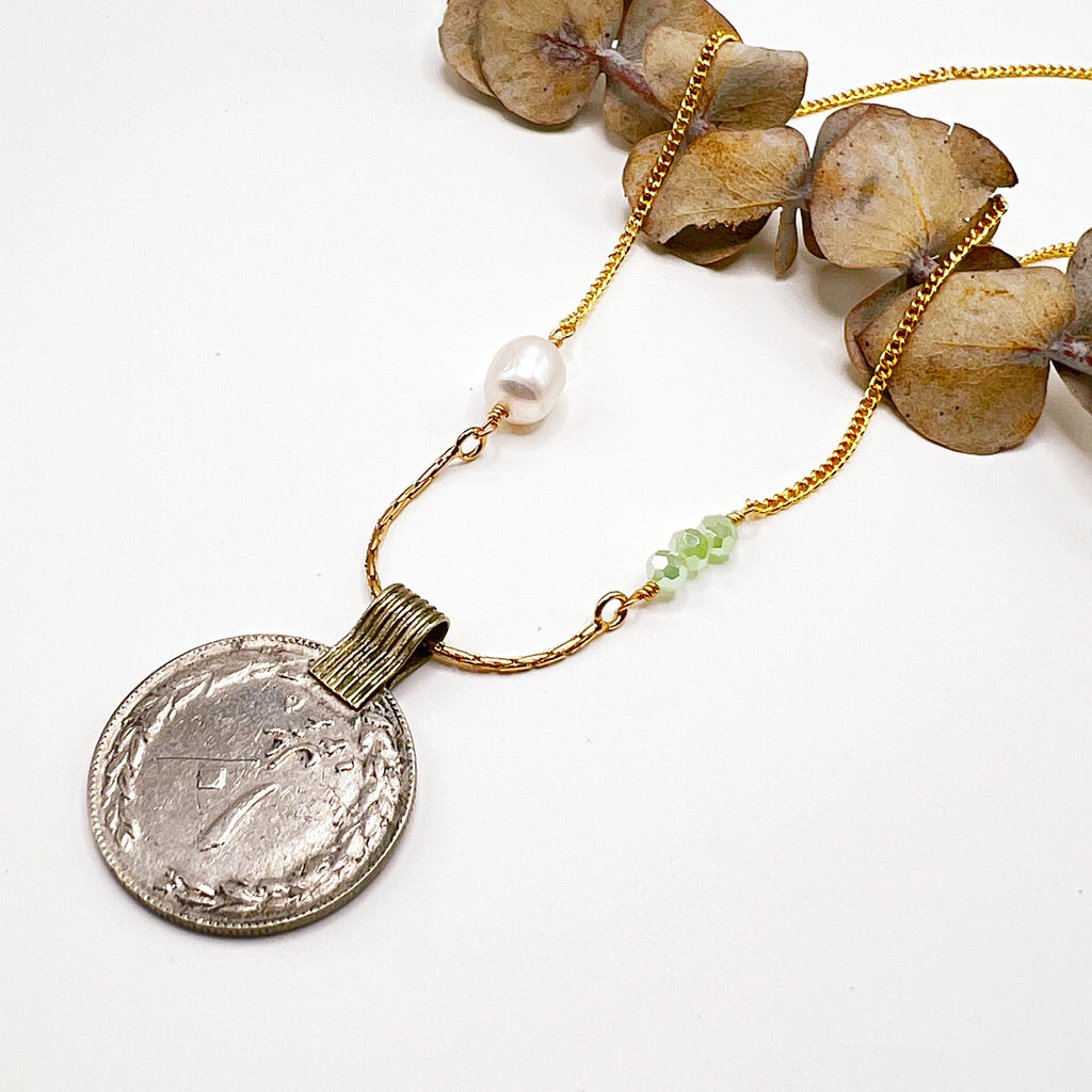 Vintage Coins sourced from throughout the Middle East. Vintage Brass Chain. Vintage stones and pearls.