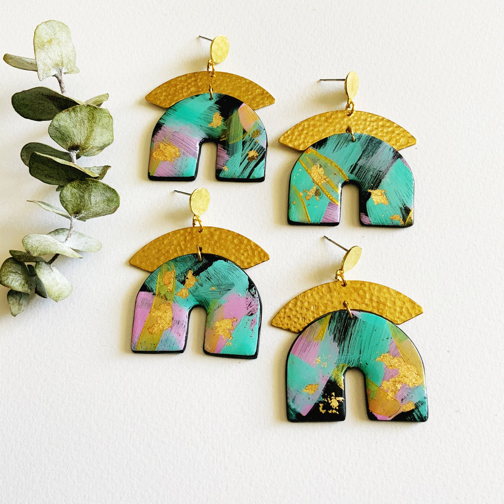 Store out of direct or bright light and humidity when not being worn. Buff metal with a gentle brass polishing cloth. To clean the surface of your hand painted piece gently rinse in diluted dish soap and water. Pat carefully to dry. Like all handmade jewelry please avoid harmful chemicals which might oxidize your piece, for example hairspray and sunscreen applied directly to the surface of your piece. Put your earrings on after aerosols.