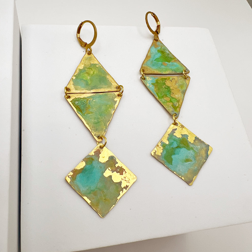 Please care for your earrings with as much love as I put in to creating them. Store in a place where they will not get scratched, such as a jewelry box or earring hanger. Although they are sealed with 2 coats of jewelry sealer sharp objects might alter the surface of the patina.