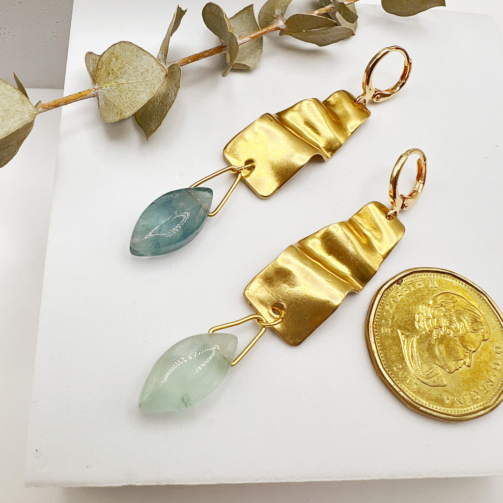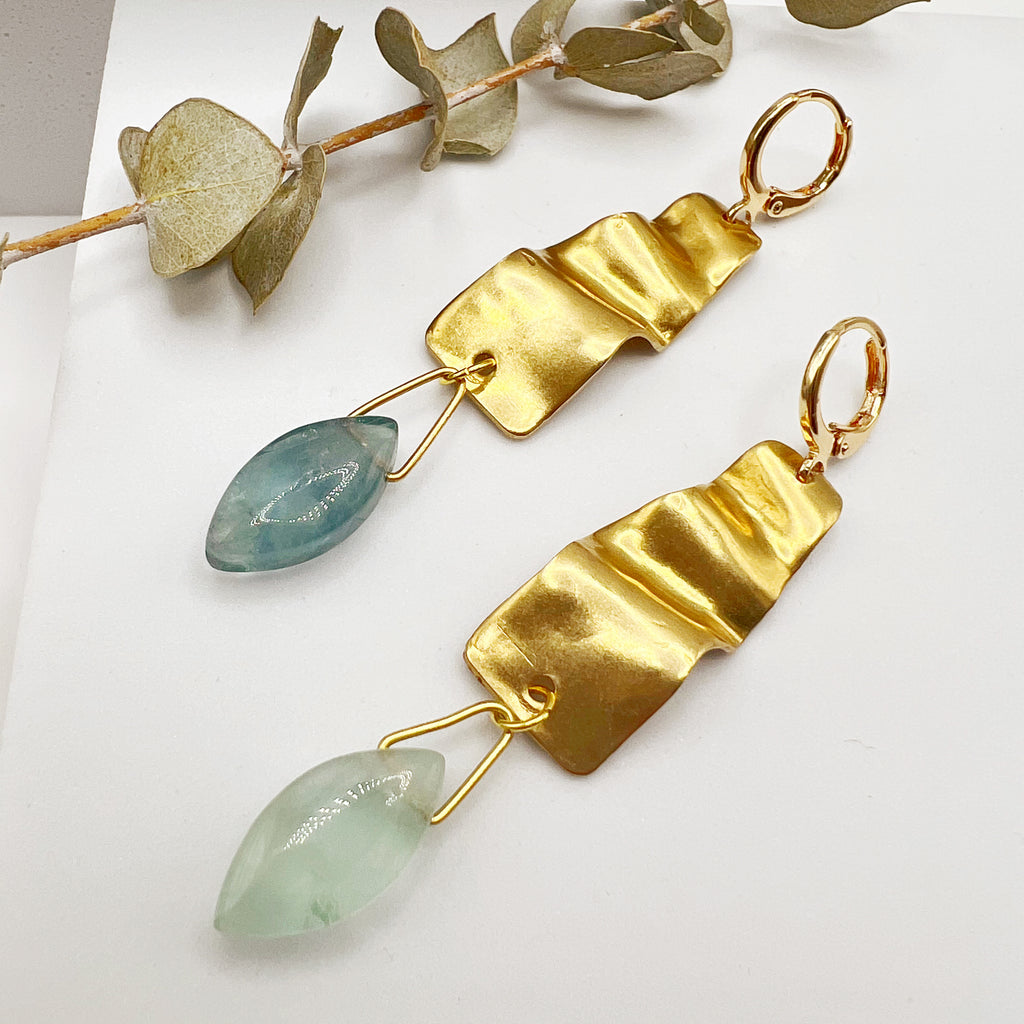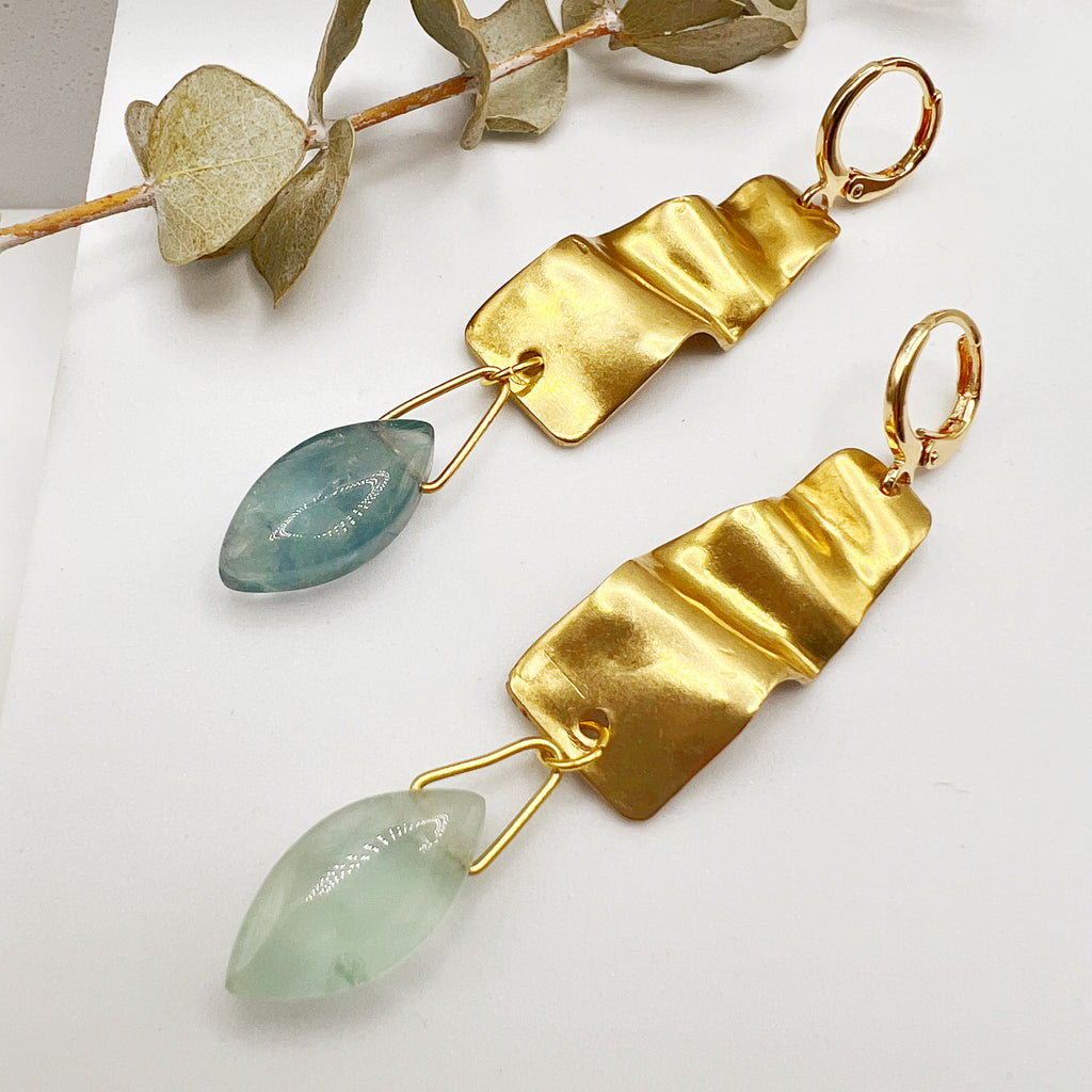 A surprisingly lightweight pair of statement drops. Handmade from vintage brass and vintage semi-precious stones, in this case a delicate and luminous stone called fluorite.