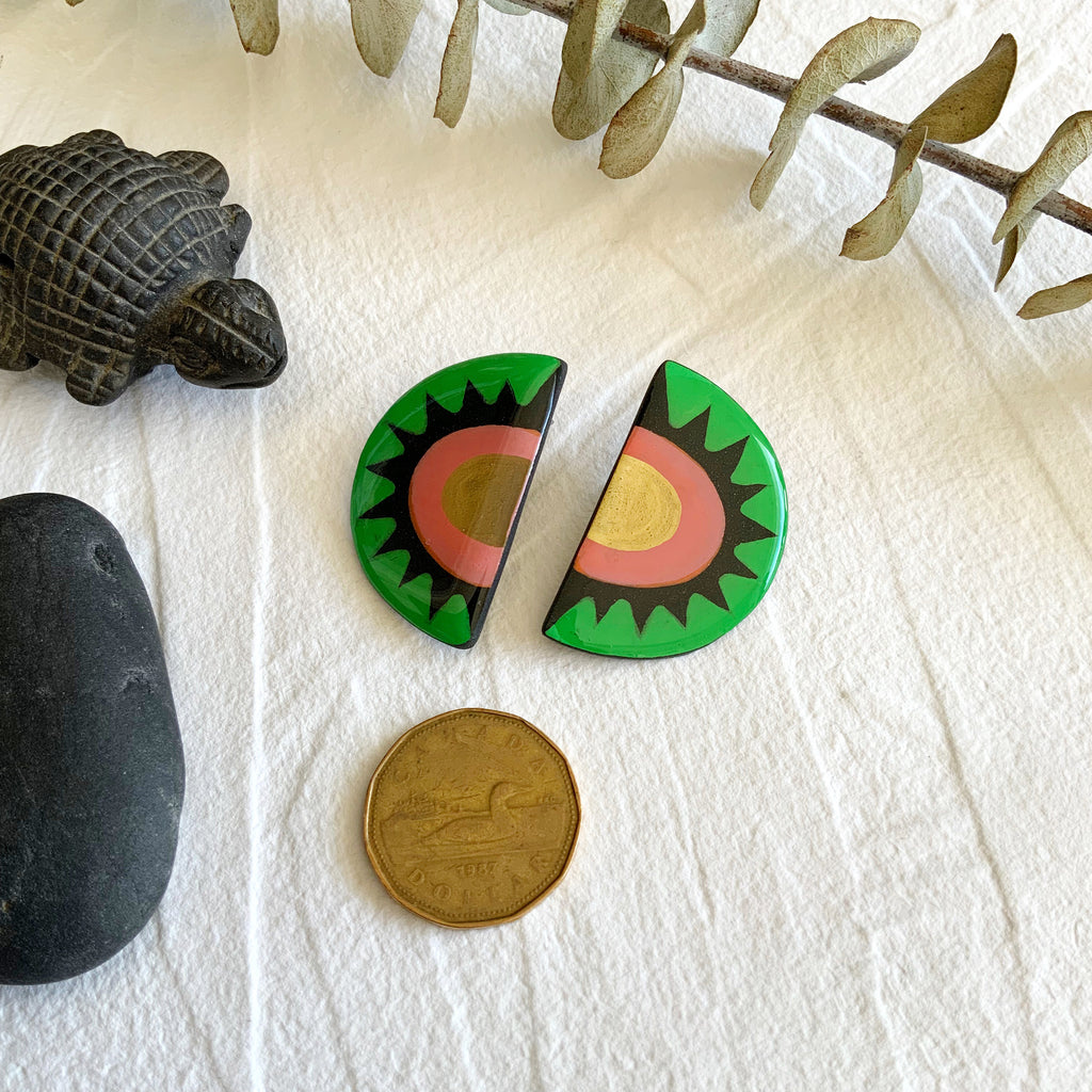 Store out of direct or bright light and humidity when not being worn. Buff metal with a gentle brass polishing cloth. To clean the surface of your hand painted piece gently rinse in diluted dish soap and water. Pat carefully to dry. Like all handmade jewelry please avoid harmful chemicals which might oxidize your piece, for example hairspray and sunscreen applied directly to the surface of your piece. Put your earrings on after aerosols.