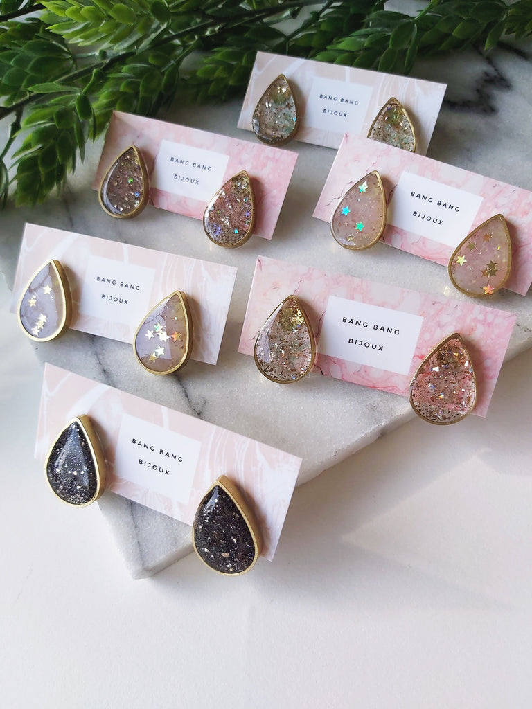 This collection is created using Eco-Resin, Glitter, Vintage Glass Flakes, and Ethically Sourced Mica Pigments. Available in a multitude of shades. We have our fan faves, but we also love creating based on your store's unique aesthetic!