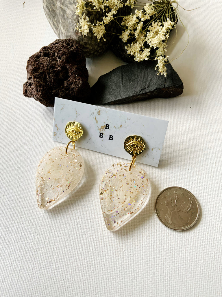 Made from eco-resin, crushed seashells, vintage glitter, and glimmering brass.