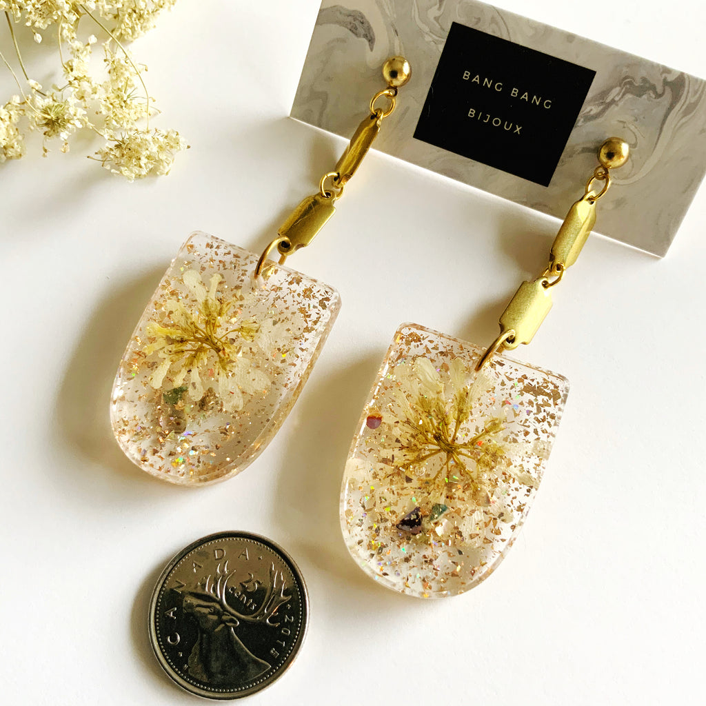 Made from eco-resin, crushed seashells, vintage glitter, and glimmering brass.