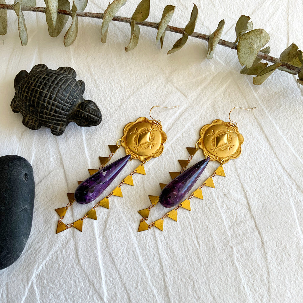 Store out of direct or bright light and humidity when not being worn. Buff metal with a gentle brass polishing cloth. To clean the surface of your hand painted piece gently rinse in diluted dish soap and water. Pat carefully to dry. Like all handmade jewelry please avoid harmful chemicals which might oxidize your piece, for example hairspray and sunscreen applied directly to the surface of your piece. Put your earrings on after aerosols.