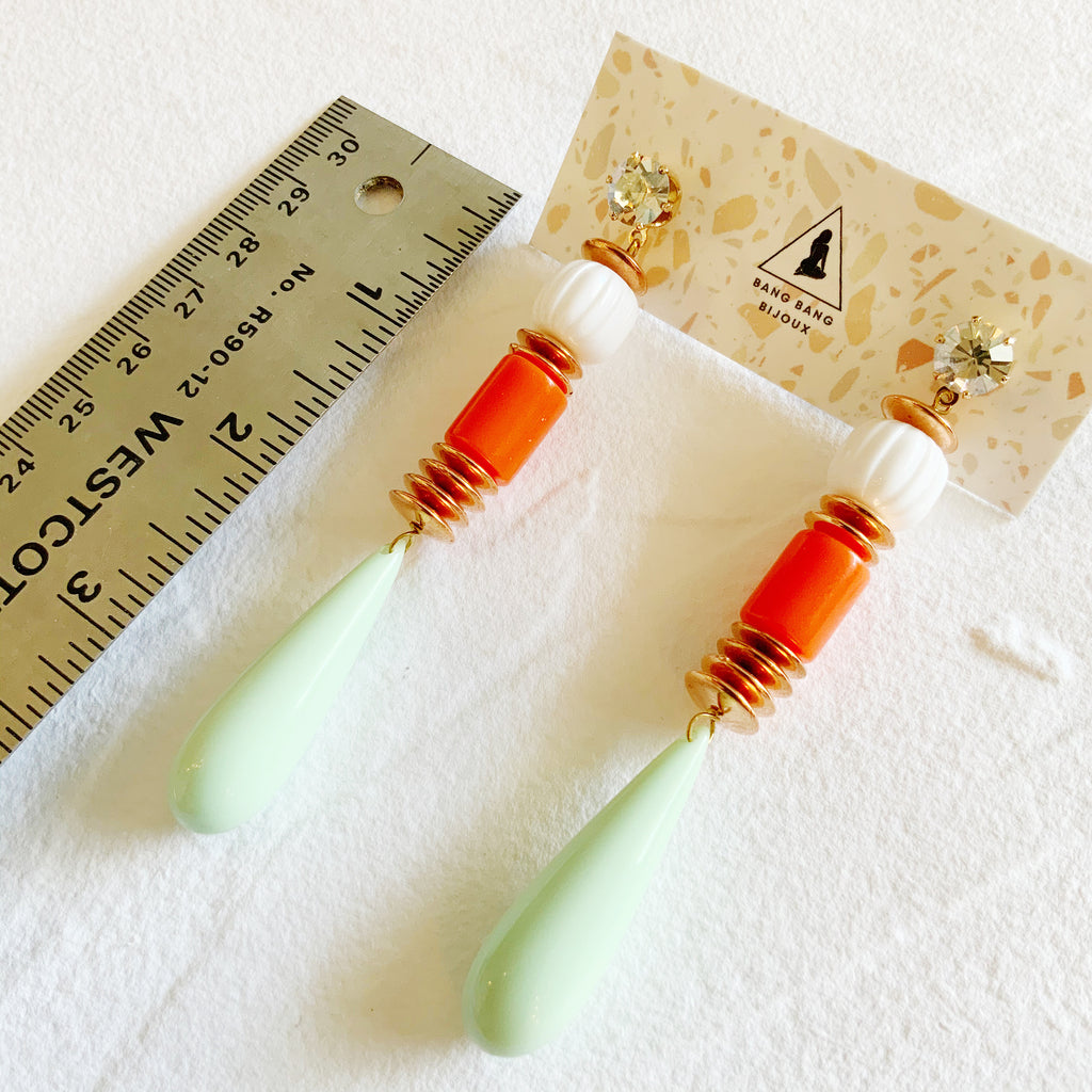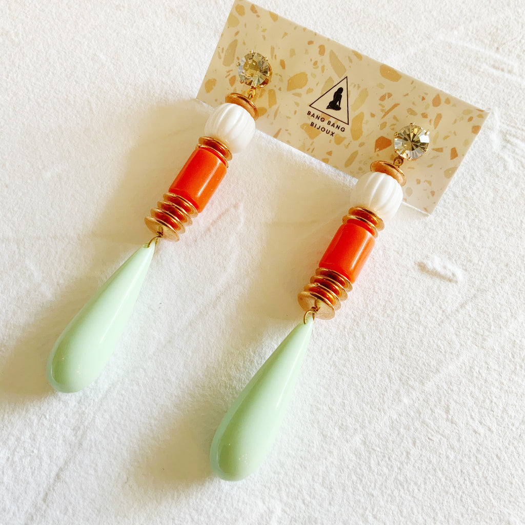 These one-of-a-kind statement earrings are created from vintage materials such as lucite and Swarovski Crystals.