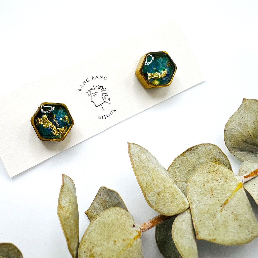 Handmade Resin Studs. Created from eco-resin, fair-trade mica, and various vintage glitters and colouring.
