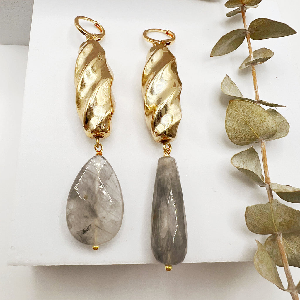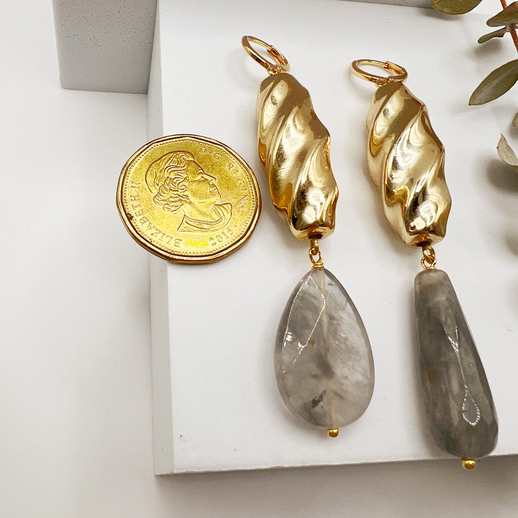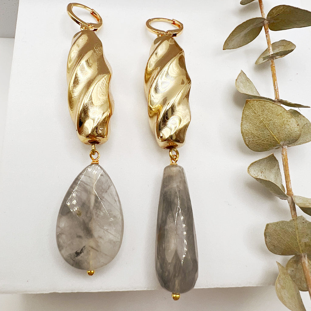 A surprisingly lightweight pair of statement drops. Handmade from vintage gold-plated lucite, and vintage semi-precious stones. Lucite is the ultimate lightweight vintage material. A superbly durable plastic that stands the test of time!