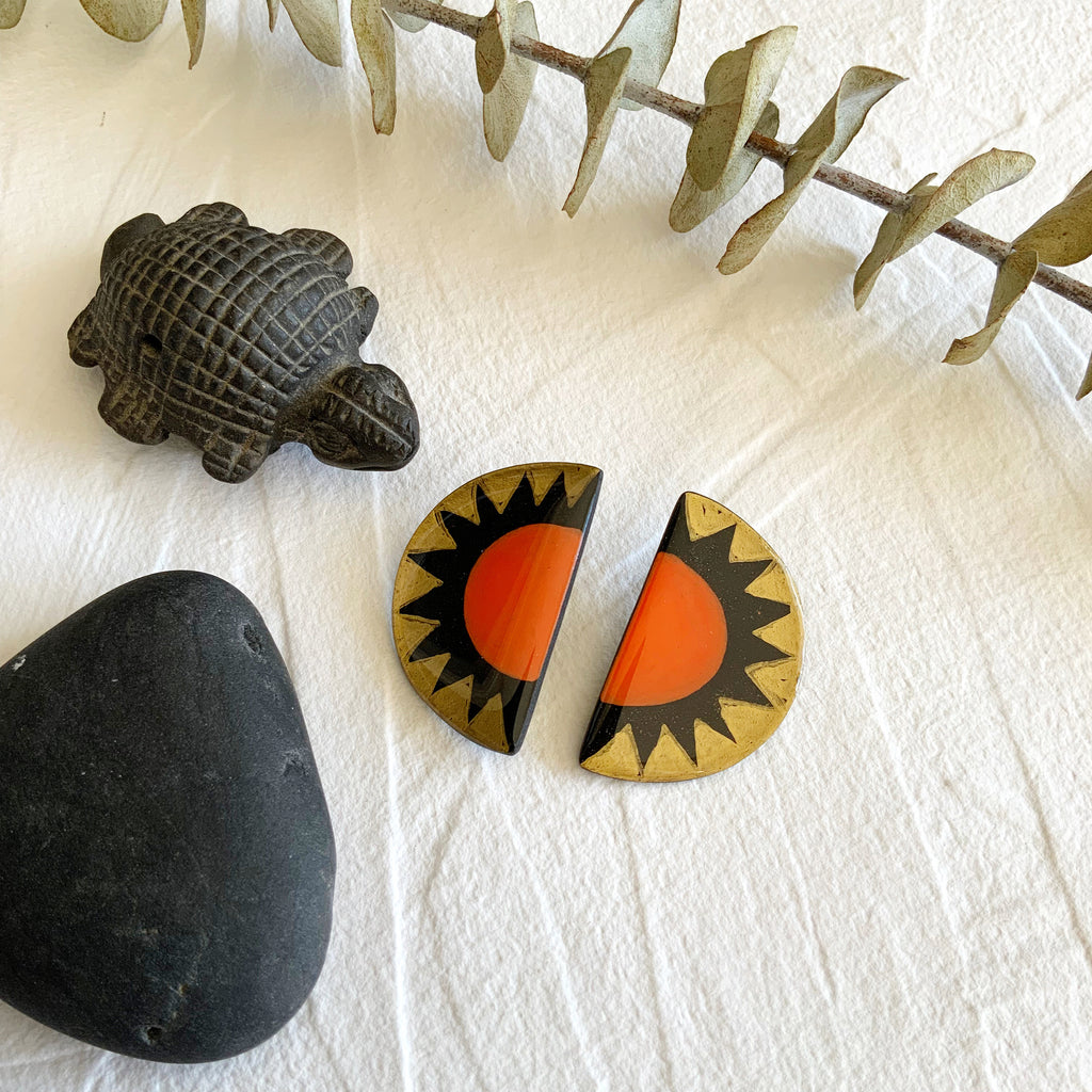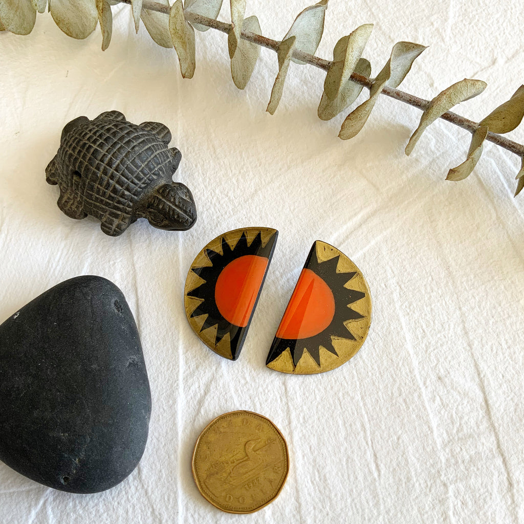 Store out of direct or bright light and humidity when not being worn. Buff metal with a gentle brass polishing cloth. To clean the surface of your hand painted piece gently rinse in diluted dish soap and water. Pat carefully to dry. Like all handmade jewelry please avoid harmful chemicals which might oxidize your piece, for example hairspray and sunscreen applied directly to the surface of your piece. Put your earrings on after aerosols.