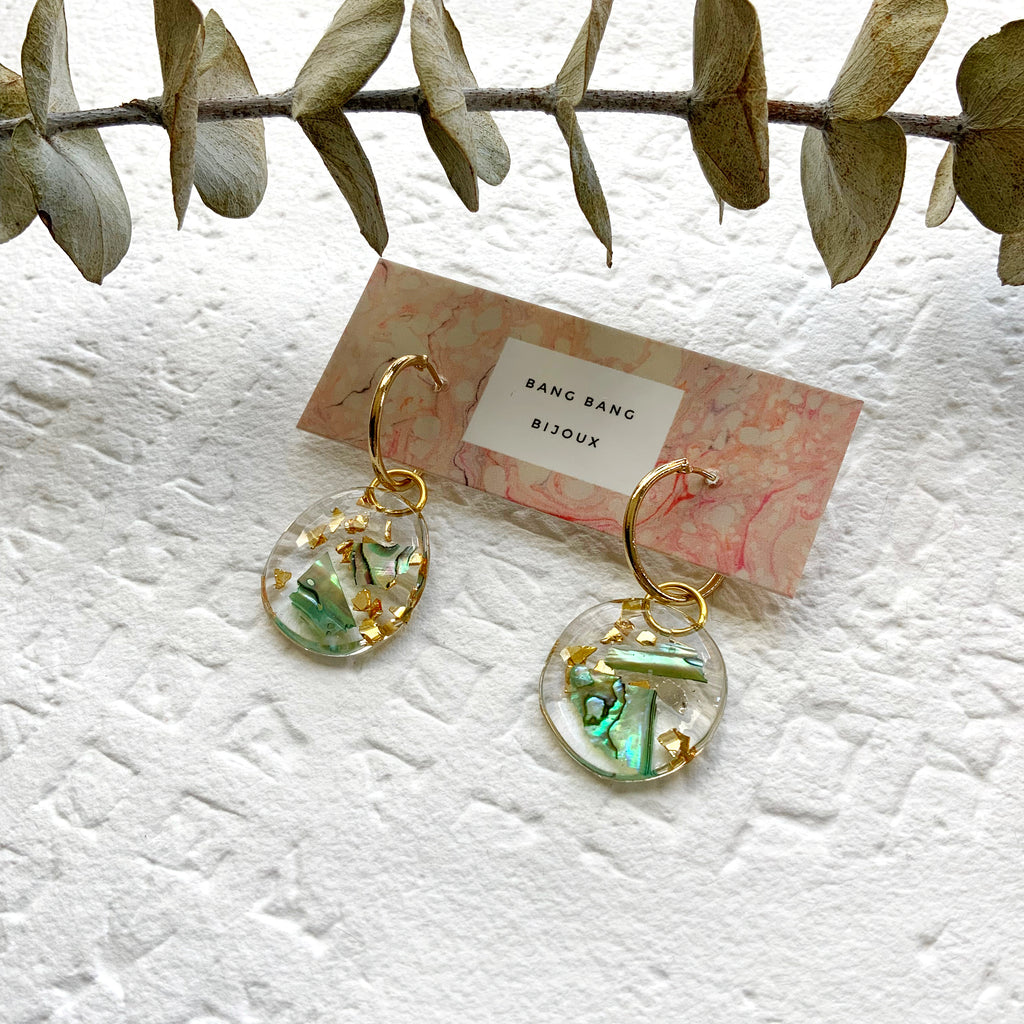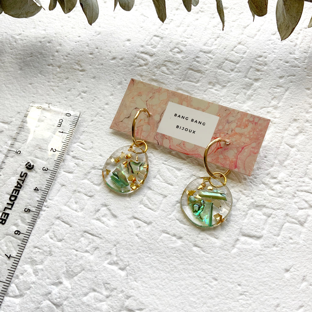 Handmade from eco-resin. Each piece is hand formed and therefore unique in its exact shape. All photos are a close approximation of the pair that you will receive.
