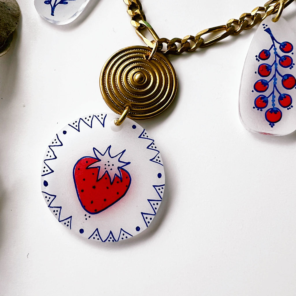 Each illustrated charm is painted entirely by hand on acrylic! All beads are vintage, bold, and beautiful to compliment the vivid hues of your charms!