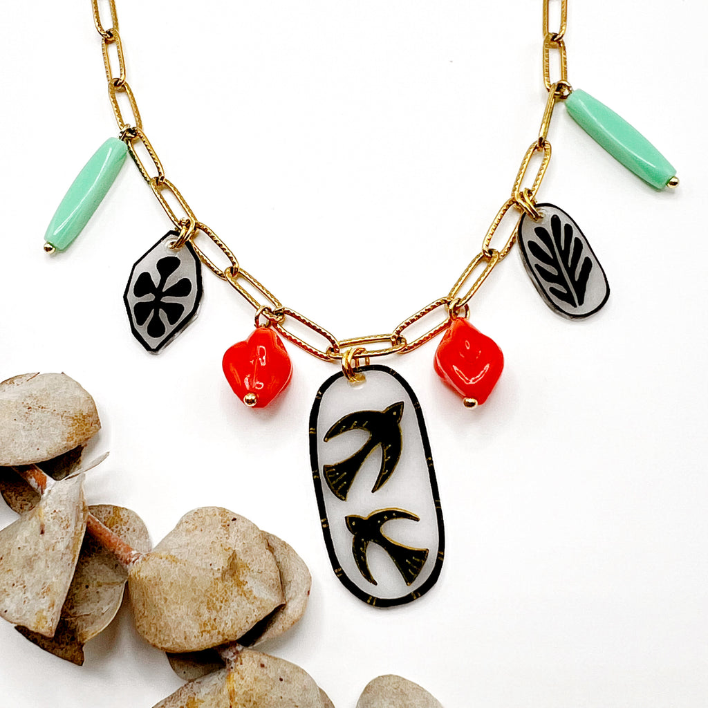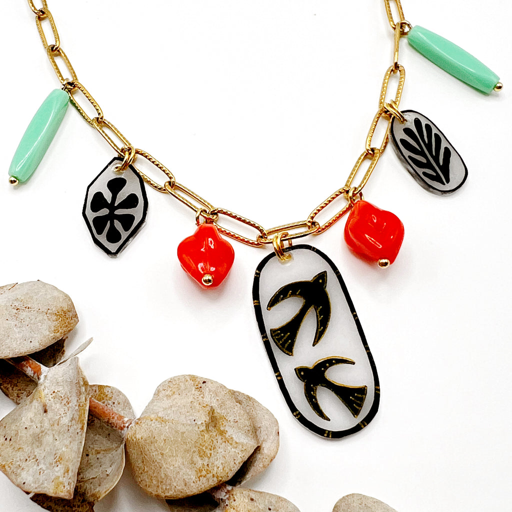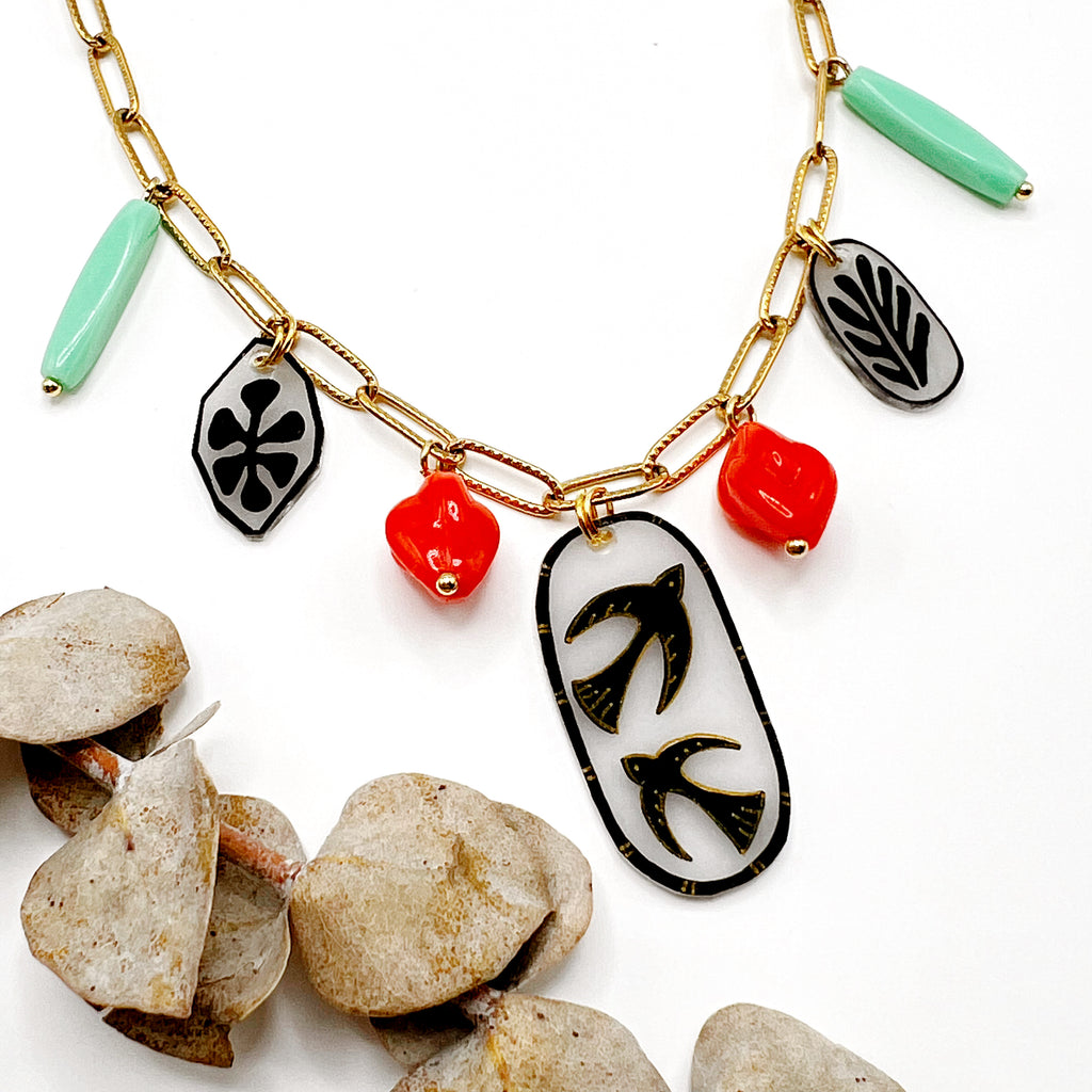 Each illustrated charm is painted entirely by hand on acrylic! All beads are vintage, bold, and beautiful to compliment the vivid hues of your charms!
