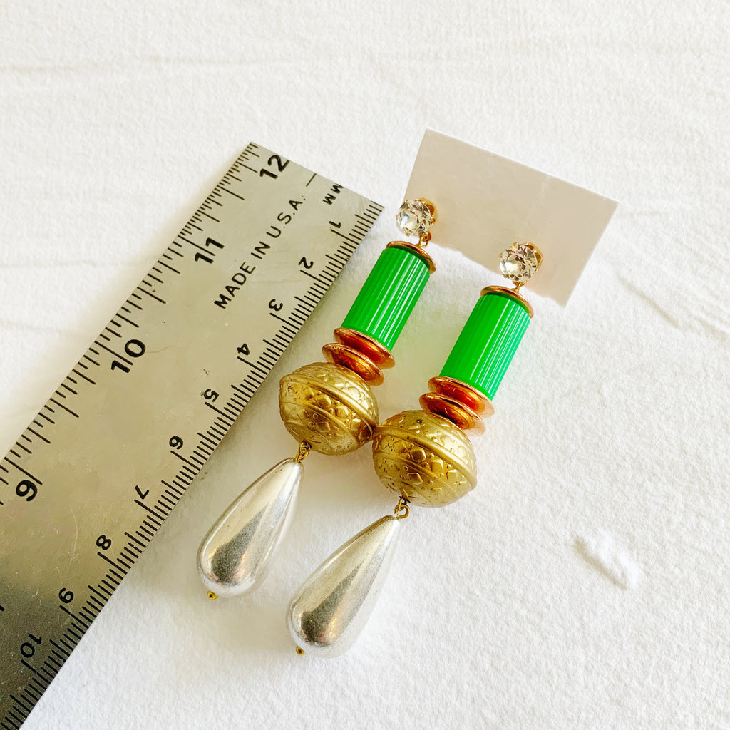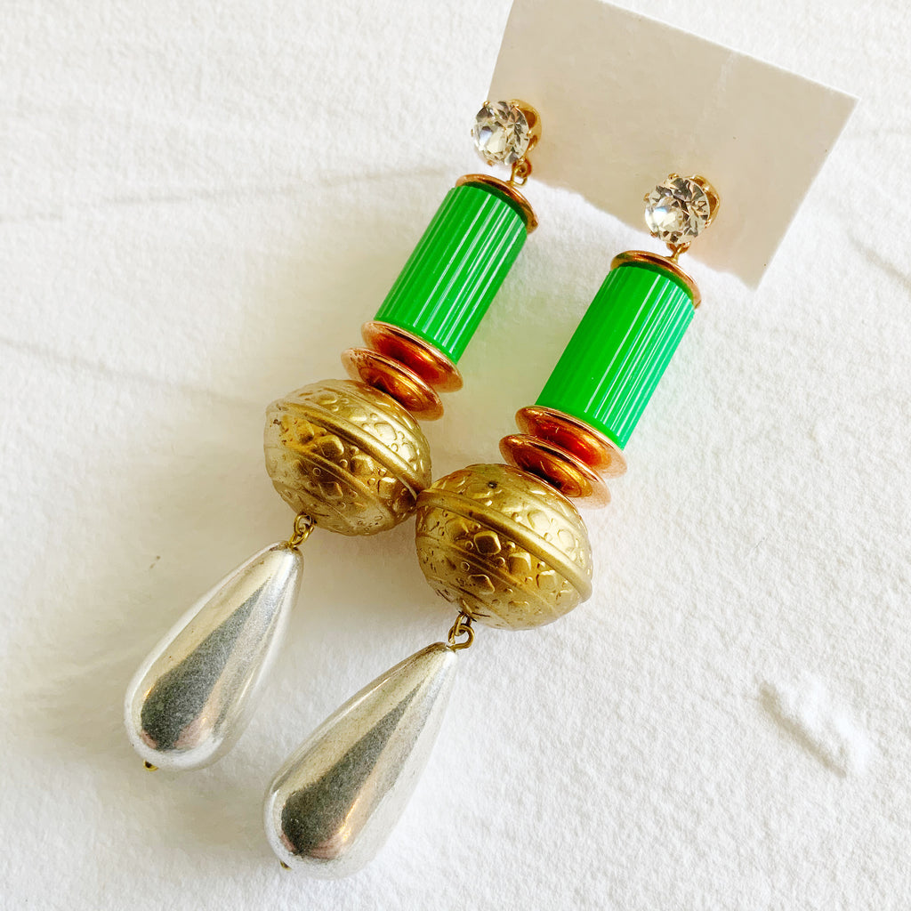 These one-of-a-kind statement earrings are created from vintage materials such as lucite and Swarovski Crystals.