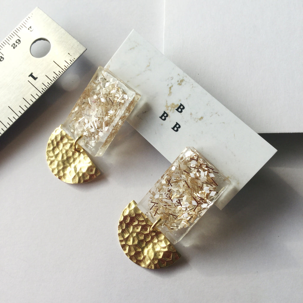 Made from Eco-Resin, Acrylic, Corrugated Brass, and Surgical Steel Posts. Lightweight and comfortable to wear.