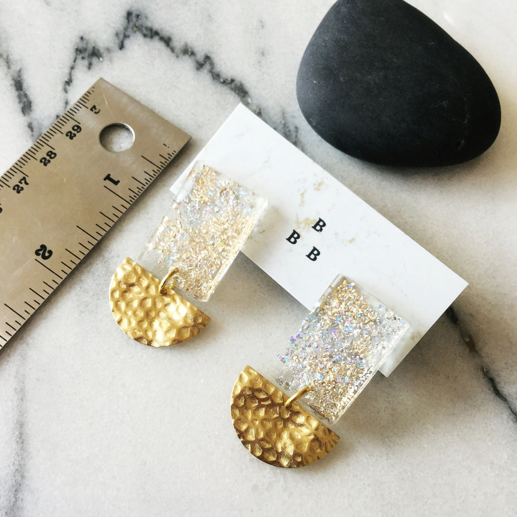 Made from Eco-Resin, Acrylic, Corrugated Brass, and Surgical Steel Posts. Lightweight and comfortable to wear.