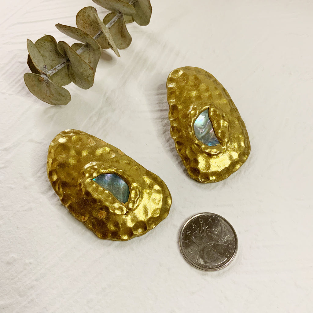Handmade from polymer clay and fairtrade mica. Embellished with vintage abalone cabochons from the 70’s.